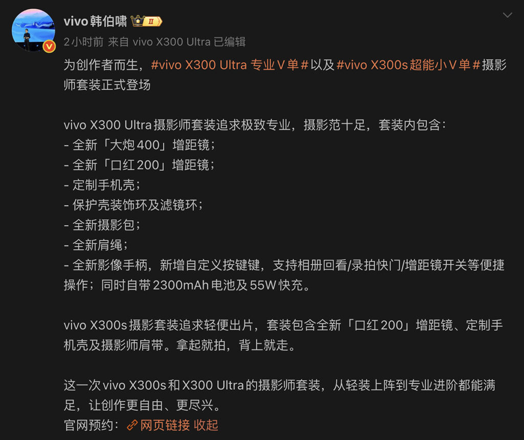 vivo X300 Ultra 跟 X300s 攝影師套裝資訊,由 vivo 產品經理韓伯嘯透過微博帳號展示,包括官方渲染圖跟配件詳細訊息均全面披露。