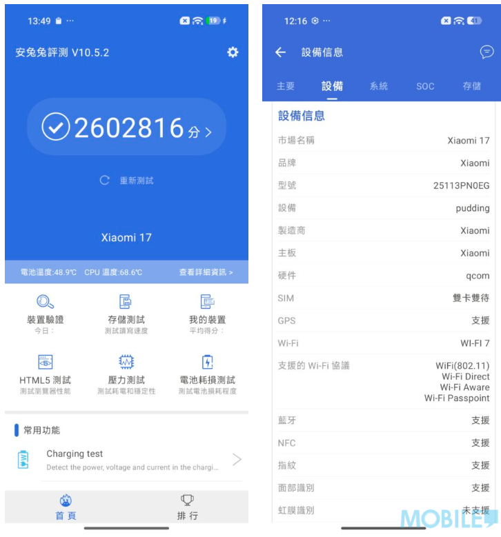 效能方面,Xiaomi 17 率先搭載了 Snapdragon 8 Elite Gen 5 處理器,採用台積電 3nm 製程。這校晶片的主頻高達 4.6GHz,配合 Adreno 840 GPU,無論是處理繁重的多任務作業,還是運行對畫質要求極高的 3D 遊戲,都能保持極高且穩定的幀率。更重要的是,小米在散熱系統上做了深度優化,即使在長時間高負載運作下,機身溫度仍維持在合理範圍,沒有明顯的燙手感,確保了效能的持續釋放。