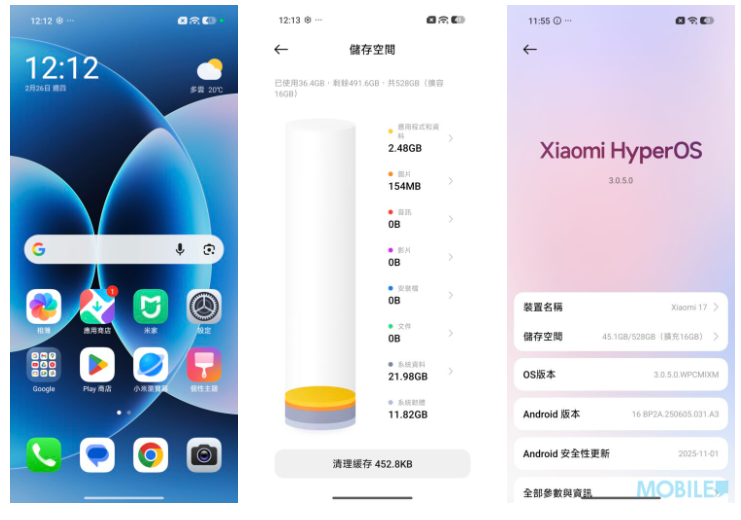 ▲Xiaomi 17 預載了基於 Android 16 的 HyperOS 3.0.5.0,深度整合了 AI 技術。512GB ROM 版扣除原裝系統後,仍有 419.6GB 空間供用戶使用。