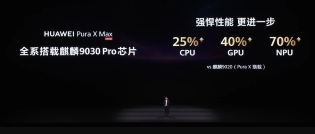 效能核心搭載了 Kirin 9030 Pro 芯片,整體性能相比前代提升 30%,其中 CPU 提升 25%、GPU 提升 40%、NPU 則大幅提升 70%,並加入硬件級實時光線追踪加速功能。