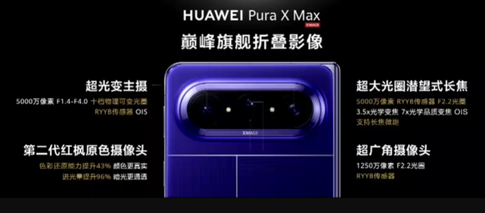 HUAWEI Pura X Max 主鏡頭為 5000 萬像素超光變攝像頭,支援 F1.4–F4.0 十檔物理可變光圈,並配備 OIS 與 RYYB 感光元件。長焦部分則採用 5000 萬像素超大光圈潛望鏡頭,提供 3.5 倍光學變焦及 7 倍光學品質變焦,進光量表現顯著優於同類旗艦機型,同時支援長焦微距拍攝。此外,機身還配備了 1250 萬像素超廣角鏡頭以及第二代紅楓原色鏡頭,後者使色彩還原能力提升 43%,進光量提升 96%,並全面支援 XMAGE 智拍與 AI 人像精修。