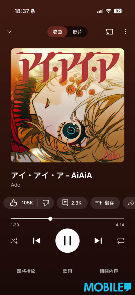 ▲ 經 YouTube Music 串流 Ado《AiAiA》,女聲聲嘶氣泡音逼真、配樂動態效果出眾