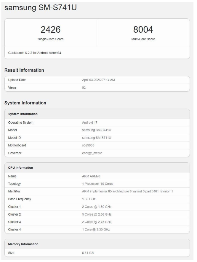 據基準測試版本 6.2.2 的紀錄顯示,這款新機在單核心運算獲得 2,426 分,而多核心運算則衝上 8,004 分。這項跑分紀錄同時揭露了核心硬體規格,該測試機確認搭載 Samsung 自家研發的 Exynos 2500 處理晶片,並配備 8GB RAM。值得留意的是,系統資訊顯示該機正運行 Android 17 版本。