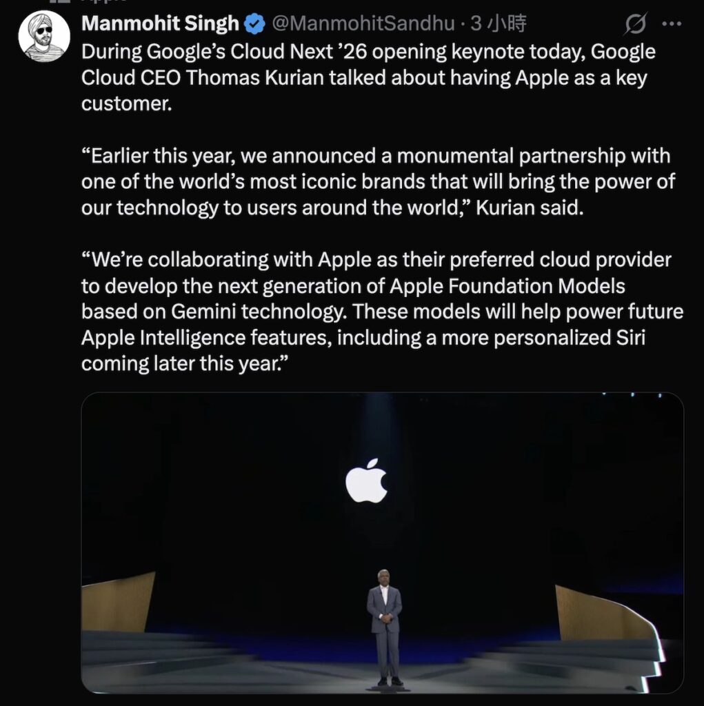 據 @ManmohitSandhu 在 X 帳號發言,指 Google Cloud CEO Thomas Kurian 早前在 Google Cloud Next ’26 開幕演講中,確認 Apple 為關鍵客戶。