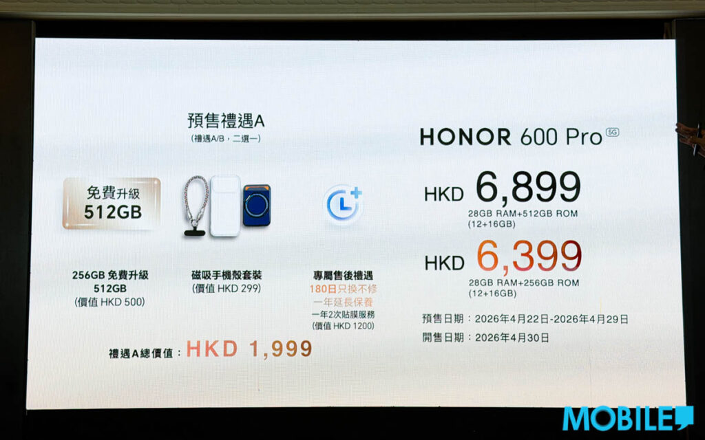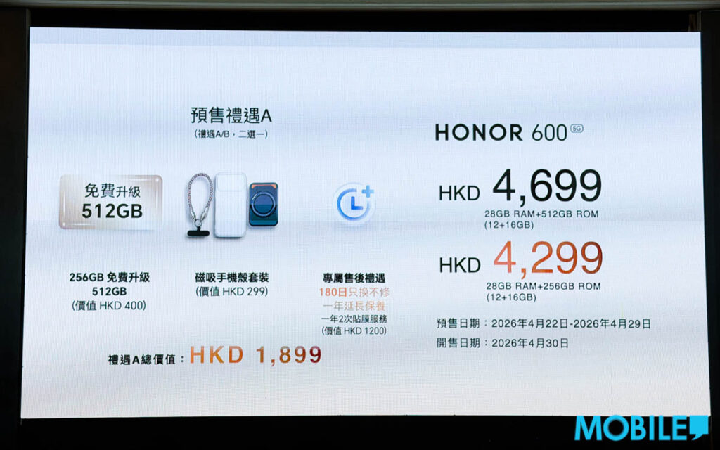 4 月 22 至 29 日 HONOR 600 預售優惠亦分為 A/B 類,A 類(總值 $1,899)同為 256 免費升 512 GB、磁吸手機殼套裝及專屬售後禮遇。