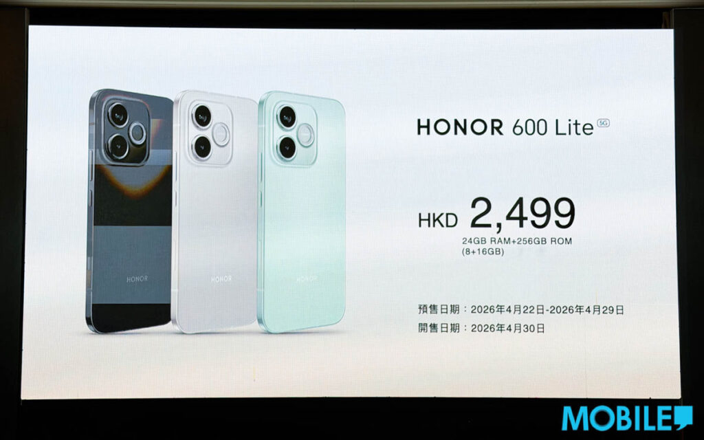 今日(4 月 22 日)HONOR 在港舉行發佈會,正式推出 HONOR 600 Series 手機。這次港版將具 HONOR 600 Pro、HONOR 600 及 HONOR 600 Lite 三作,入場價低至 $2,499 起,現時已開放預售、並將於 4 月 30 日正式開賣。