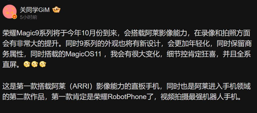 影像系統方面,Magic 9 系列將再度迎來重量級合作。繼早前的合作企劃後,該系列將成為 ARRI 專業影像技術在行動通訊領域的第二部作品。這意味著新機在動態錄影與靜態攝影的色彩調校、光影處理上,將導入更多電影級的專業技術,有望再次推高行動影像的技術標竿。此外,Magic 9 系列的機身外觀設計亦傳出會進行大幅度優化,雖然目前尚無法確認機背指標性的圓形相機模組是否會被取代,但整體設計語彙預料會更符合現代極簡美學。