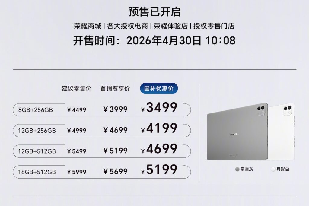 HONOR MagicPad 3 Pro 12.3 已在國內開放預售,4 月 30 日(下週四)開賣,具星空灰及月影白雙色款,早鳥價低至 3,999 人民幣(約港幣 $4,590)起。