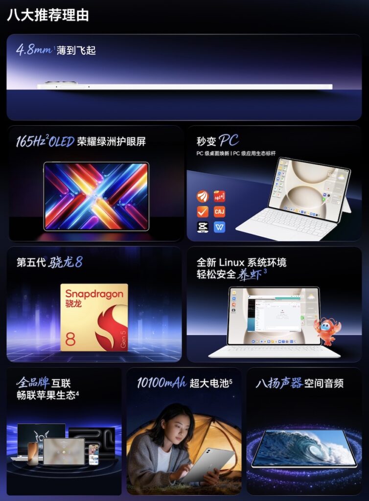 HONOR MagicPad 3 Pro 12.3 薄至 4.8mm、機重低至 450g 但就配備 12.3 吋 3,000 x 1,920 像素 165Hz 更新率 OLED 螢幕,畫面更勝 13.3 吋版本。