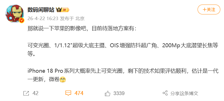 近日據內地知名爆料達人「數碼閒聊站」在微博上的最新消息,Apple 計劃由今年九月推出的 iPhone 18 Pro 系列開始,展開一連串重大的影像系統更新,務求透過每年一項重點硬體升級,逐步提升其攝錄實力。