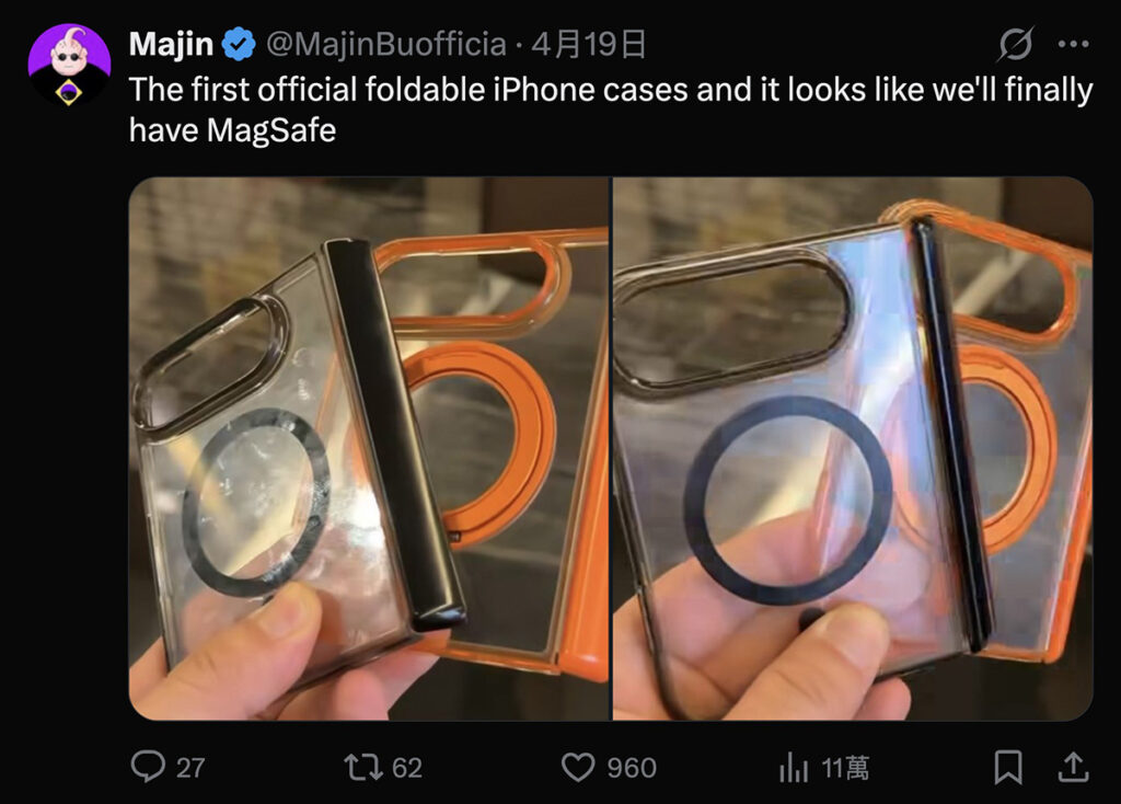 爆料達人 @MajinBuoffcia 早前在 X 帳號,展示副廠為 iPhone Fold(暫稱)設計的手機保護殻照片,當中可看到橫向排列主鏡頭組,跟為 MagSafe 預留磁吸圈位。