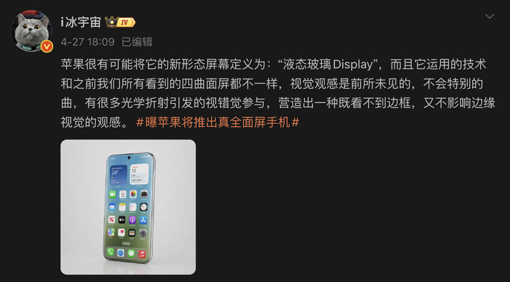 據爆料達人 Ice Universe 在微博帳號透露,蘋果將為未來 iPhone 引入名為 Liquid Glass Display 螢幕技術,讓直屏 iPhone 能享用真全屏視野,讓傳統邊框隱形。