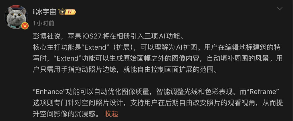 爆料人另文提到 iOS 27 系統將加入三項關於相簿的 AI 功能,包括 Extend 智能延伸相外內容、Enhance 升級相片畫質,及 Reframe 多角度瀏覽相片功能。