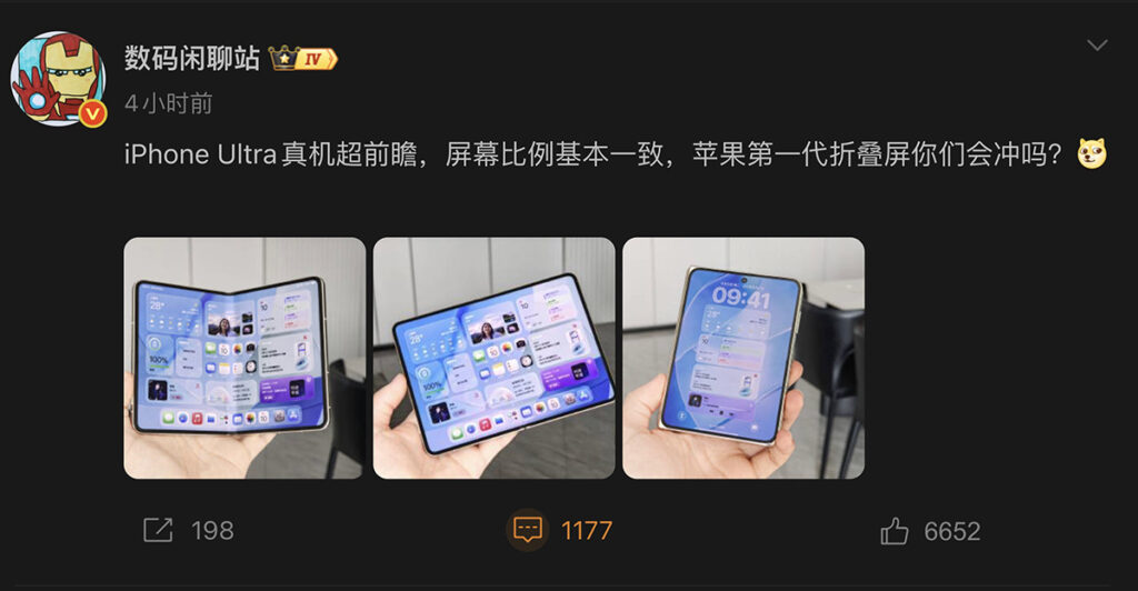 疑似 iPhone Ultra 高仿機照片,由爆料達人「數碼閒聊站」在微博帳號展示,照片中包括裝置半摺合、主屏開展跟摺合後顯示外屏正面部份。