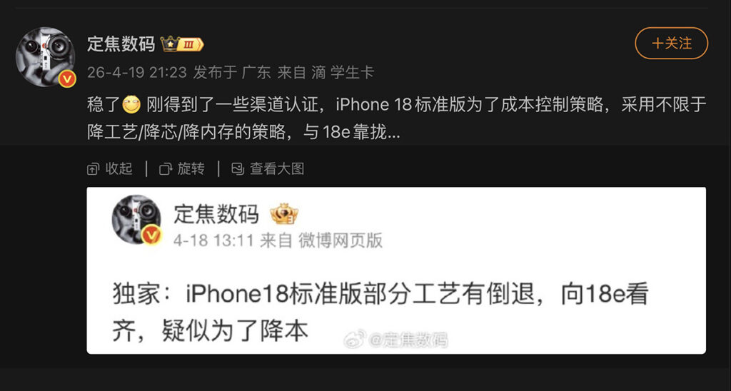 關於 iPhone 18 標準版資訊,新近有數碼博主「定焦數碼」在微博帳號提到,其可能因成本控制關係,會透過晶片工藝、核心數或儲存容量等方式作出調整。