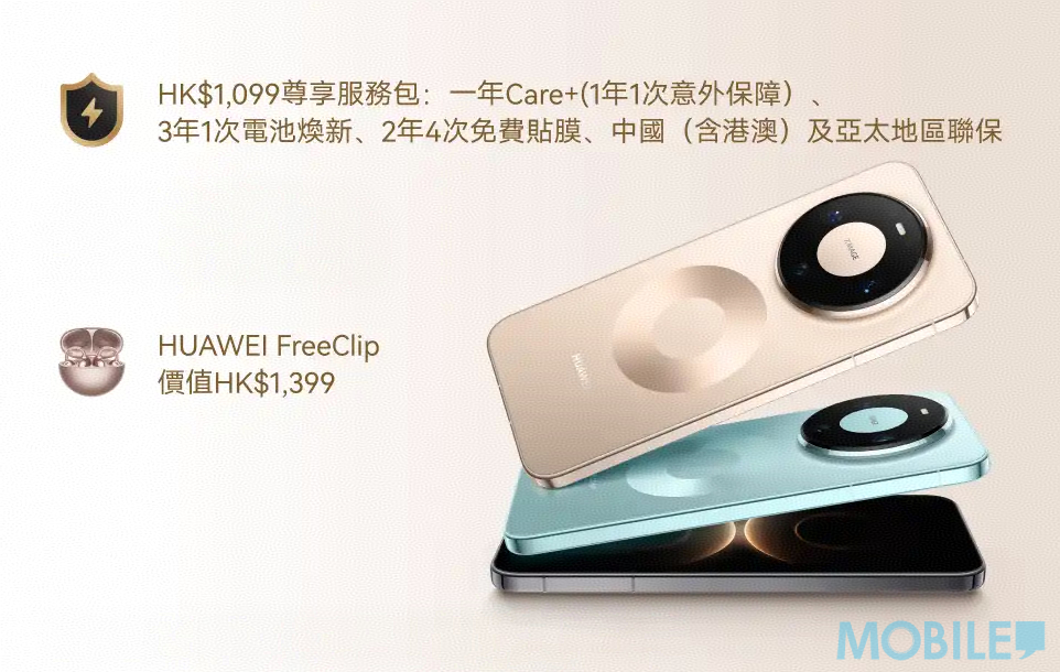 為了回饋首批買家,現時購入 Mate 80 Pro 的優惠內容相當豐厚。除了隨機贈送價值 $1,399 的 HUAWEI FreeClip 耳機,讓用家體驗獨特的耳飾設計與開放式聆聽享受外,更包含價值 $1,099 的升級尊享保養服務。這項保養計劃內容十分全面,包括首年一次意外損壞保障、首兩年四次免費屏幕貼膜、首三年一次免費電池更換以及電池煥新服務。值得一提的是,該保養亦支援中國(含港澳)及亞太地區聯保,對於經常往返兩地的用家來說無疑增加了一份安心感。