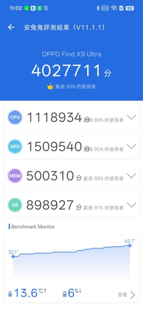 核心動力來自 Snapdragon 8 Elite Gen 5 晶片,基於 3nm 工藝與第三代 Oryon CPU 核心。跑分數據符合預期,CPU 在高負載下的穩定性極佳,雖然 GPU 在壓力測試中出現了較明顯的調頻現象,但對於非極端遊戲玩家而言,日常與影像處理性能完全過剩。