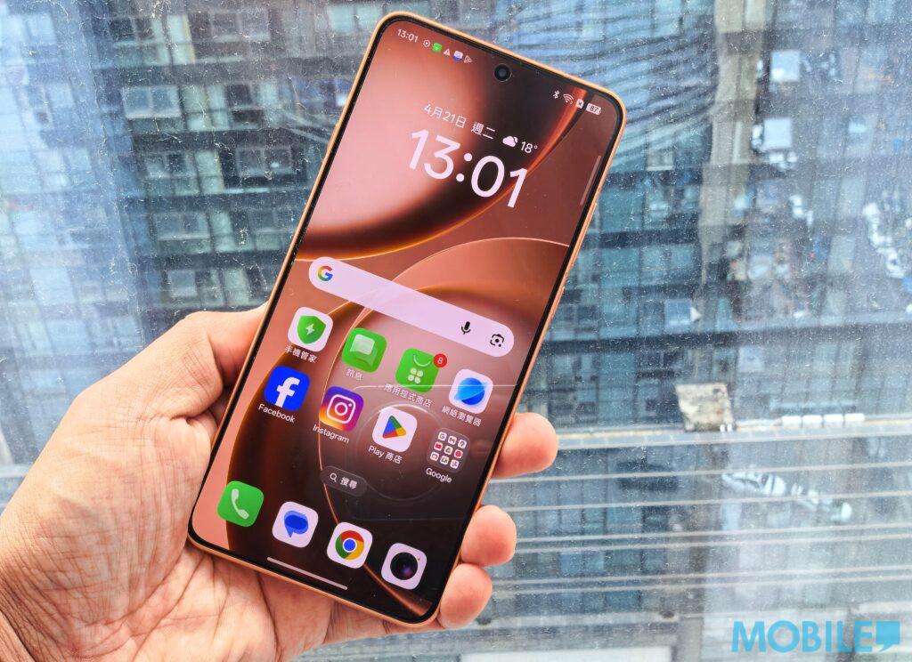 這代 Find X9 Ultra 棄用了傳統的玻璃背蓋,改以素皮與鋁合金拼接。雖然取消了雙色調設計,但貫穿機身下半部的金屬條帶來了極高的辨識度。機身風格趨向方正,採用平直的中框與前後面板,整體重量達 236g,厚度為 9.1mm(Canyon Orange 版本為 8.65mm)。儘管份量十足,但得益於素皮的抓握感,手持感相當穩健。