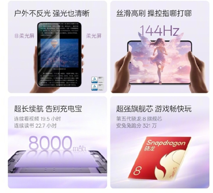 核心硬件方面,OPPO Pad Mini 首款採用 Snapdragon 8 Gen 5 旗艦處理器的小尺寸平板,於 AnTuTu 跑分成績突破 321 萬分。儘管機身纖薄,廠方仍內置了 8000mAh 大容量電池,據官方測試數據,其影片連續播放時間可達 19.5 小時。