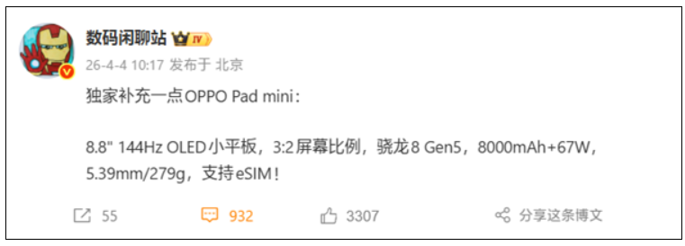 - OPPO Pad mini 將搭載 S8 Gen 5 兼支援 eSIM 功能!
