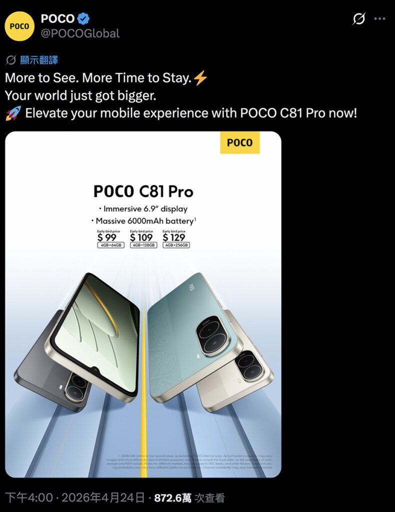 據 POCO 公佈資訊,POCO C81 Pro 提供黑、金及綠色款選擇,提供 4+64、4+128 跟 4+256 三種儲存配置,國際版售價由 99 美元(約 $780)起。