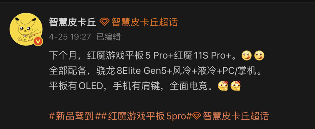 數碼博主「智慧皮卡丘」早前在微博帳號透露,RedMagic 將於 5 月發表紅魔遊戲平板 5 Pro、跟紅魔 11S Pro+ 等新作,並大幅加強電競功能。